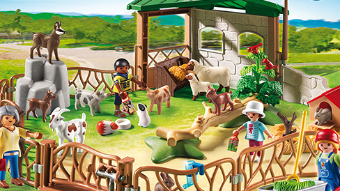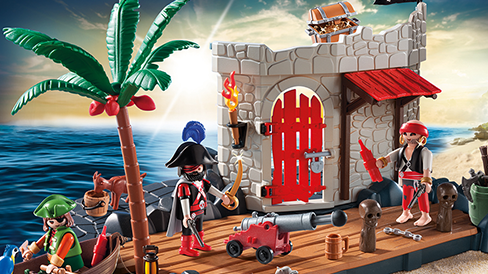 Mit Ruderboot, Schatzkiste und Hafenkanone.